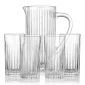 The Lead Free Crystalline Bacchus Pitcher features a contemporary design with vertical grooves that surround the pitcher and glasses. Optional Deep Etch can be done on the base.