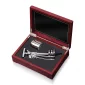 An elegant gift for any wine connoisseur, the Nottingham Wine Set's padded insert holds a chrome plated lever-style wine bottle opener and matching bottle stopper in an elegant mahogany finished wood case with silver findings and black metal lid plate for your inscription.