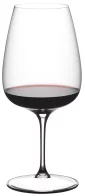 Riedel Grape Cabernet Merlot Cocktail 22oz crystal wine glass. Set of 2 in a Shadow black gift box. The flat-bottom wine glass, with its robust and modern design, is adeptly suited for the full-bodied nature of Cabernet and Merlot wines, as well as a variety of crafted cocktails. Its substantial base ensures stability, essential for the leisurely enjoyment of these rich beverages. Lead free. Elegance at it's finest. Recommended hand wash only. 9.25" H x 4.14" Diameter