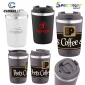 12 Oz. Vacuum insulated double wall coffee mug with a flip up lid. Powder coated 18/8 stainless steel with copper lining; screw on, leak proof open lock lid. Keeps contents cold for 24 hours or hot for 12 hours. Not microwave safe; hand wash only; BPA free. Packaged in a retail box. 5 1/2" H x 3 1/2" Diameter
