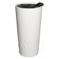 This 14 Oz. (414 ml) double wall ceramic tumbler, with textured matte finish exterior lower panel, features a polypropylene plastic slide locking lid. It is designed for use with hot and cold beverages. Hand wash only. Do not microwave. CAUTION: item may leak if tipped or held upside-down. Up to 2 colors is available for pad printing. The imprint area is reduced to 2"x1.5" for multi-color orders. Complies with Prop 65. 6.75" H x 2.5" Diameter
