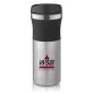 16 Oz. Stainless steel outer wall with bold metallic color finish; double wall insulation with plastic liner; shiny chrome accent; black rubber center band detail for easy-grip; black plastic twist-on lid with slide lock prevents spills; non-slip bottom. Not microwave or dishwasher safe. 3 1/4" Diameter x 8 1/4" H