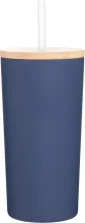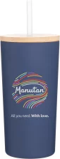 16.9 oz double wall 18/8 stainless steel tumbler with copper vacuum insulation, push-on bamboo lid, soft straw, and powder coated finish. Individual gift box. Hand wash recommended. Do not microwave. Complies with FDA, Prop 65. 6.6" H x 3.3" W