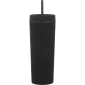 17 oz double wall acrylic tumbler with matching threaded lid, matching soft straw, and rubberized finish. Hand wash recommended. Do not microwave. Complies with FDA, Prop 65. 8.5" H x 3.25" W