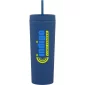 17 oz double wall acrylic tumbler with matching threaded lid, matching soft straw, and rubberized finish. Hand wash recommended. Do not microwave. Complies with FDA, Prop 65. 8.5" H x 3.25" W