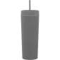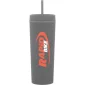 17 oz double wall acrylic tumbler with matching threaded lid, matching soft straw, and rubberized finish. Hand wash recommended. Do not microwave. Complies with FDA, Prop 65. 8.5" H x 3.25" W