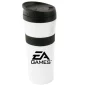 20 oz. stainless steel tumbler. Plastic screw-on lid. Silicon band decoration. 3.375" W x 8.375" H