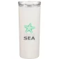 20.9 oz double wall 18/8 stainless steel thermal tumbler with copper vacuum insulation, push-on lid, matching swivel, and matte pearlized finish. Hand wash recommended. Do not microwave. Complies with FDA, Prop 65. 8.375" H x 3.25" Diameter x 3.5" W