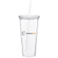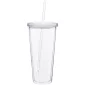 20 oz double wall acrylic tumbler with threaded lid and matching soft straw. Hand wash recommended. Do not microwave. Complies with FDA, Prop 65. 8.125" H x 4.125" W