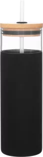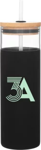 25 oz single wall borosilicate glass tumbler with matching push-on lid, soft straw, and matching protective silicone sleeve. Individual gift box. Hand wash recommended. Do not microwave. Complies with FDA, Prop 65. 9.2" H x 3" W