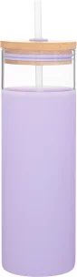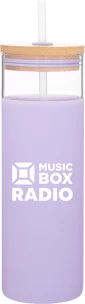 25 oz single wall borosilicate glass tumbler with matching push-on lid, soft straw, and matching protective silicone sleeve. Individual gift box. Hand wash recommended. Do not microwave. Complies with FDA, Prop 65. 9.2" H x 3" W