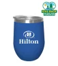 12 oz. stainless steel, double wall, vacuum sealed wine tumbler with clear plastic, leak-proof lid. Brushed stainless at rim, lightly textured, powder coated finish on exterior. Hand wash only. 4 1/2" W x 3 1/4" H