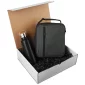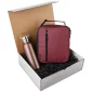 Kraft gift box packed with Vacuum Insulated Tumbler and Austin Collection heathered cooler bag. 20 Oz. (600 mL) double-wall vacuum insulated (201 Stainless Steel exterior and 304 Stainless Steel lining) bottle with screw on/off Bamboo lid. Hand-wash only. Do not microwave. Do not place in freezer. Vacuum insulation helps keep your beverages hot or cold longer than traditional insulation. Designed for use with both hot and cold beverages. Caution: Item may leak if tipped or held upside down. Complies with Prop 65. 14" W x 12" H x 4" D