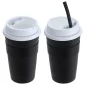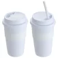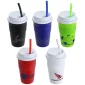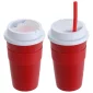 Choose a reusable travel coffee cup with added features! Bistro 14 oz Coffee Cup with Silicone Sleeve + Straw offers a comfortable grip for hot or cold beverages. Multi-functional, screw-on lid prevents spills and provides a storage compartment for the 8-3/4" reusable silicone straw. Designed to use with most standard single serve coffee makers, such as Keurig, and fits in most auto cup holders. Hand wash only. Do not microwave. BPA Free. Complies with FDA, Prop 65. 6" H x 3.25" Diameter