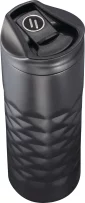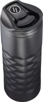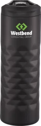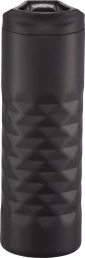 Design features an intricate geometric cut. Leak-Proof designed slide open lid. Double-wall copper vacuum insulated stainless steel construction. Keeps drinks hot for 8 hours and cold for 24 hours. Trendy, durable powder coating. Leed's Exclusive. 16oz. 2.83" D x 2.83" W x 8.66" H