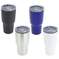 Odyssey 30 oz Stainless Steel/Polypropylene Travel Tumbler features stainless steel outer shell with black polypropylene inner lining, clear plastic lid with sliding drink opening. Keeps beverages hot or cold for up to 3 hours. Non-slip base pad on bottom. Tapered bottom fits cup holders. Hand wash only. BPA Free and FDA certified. An economical alternative to our popular Belmont 30 oz. Tumbler: DTM-BL17. Complies with FDA, Prop 65. 8" H x 3.75" Diameter