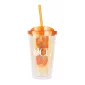 Double wall Acrylonitrile Styrene (AS) tumbler- Detachable infuser for fruit, mint, and tea- Secure, leak-resistant screw-on lid- Colored lid with matching straw. 4.0" W x 6.75" H