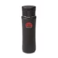 Double wall stainless steel vacuum tumbler- Matte black body with ergonomic curvature- Button operated release lid with locking feature to prevent spills- Twist on leak-proof vacuum seal lid- Angled drinking spout for easy on the go use- Keeps drinks hot/cold for up to 6 hours. 3.0" W x 9.5" H
