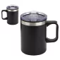 Zara 14 oz Stainless Steel/Polypropylene Mug has a matte finish stainless steel outer shell with black polypropylene inner lining and a stainless steel accent ring above the black handle that has a thumb rest. The Tritan™ plastic lid has a sliding drink opening. Keeps beverages hot or cold for up to 2 hours and has a non-skid base. Hand wash only. Must be ordered in exact case quantities. Black/Navy/White color: 50pcs/case, Red color: 48pcs/case. Orders may ship from CA location. FDA certified. Complies with FDA, Prop 65. 4.625" H x 3.25" Diameter