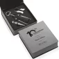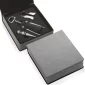The Falkland Wine Accessory Set includes three essential tools for any wine enthusiast: a wine opener, wine stopper and foil cutter. Packaged in an elegant black leatherette box, making it an ideal gift for anyone looking to enhance their wine-drinking ritual. Product Size: 6.625"W x 7.5" H x 2" D. 6.625" W x 7.5" H x 2.0" D