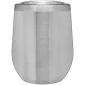 12 oz double wall 18/8 stainless steel thermal tumbler with copper vacuum insulation, stainless steel rim, and push-on clear lid. Individual gift box. Hand wash recommended. Do not microwave. Complies with FDA, Prop 65. 4.625" H x 3.5" W