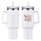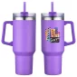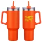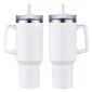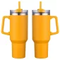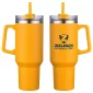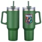 The Genoa 40 oz Mug is made of 18/8 stainless steel that is copper-lined & double-wall insulated with powder-coated matte finish. Keeps beverages hot up to 12 hours and cold up to 30 hours. Comes with 3-position color matched swivel top lid with silicone straw hole, color matched matching plastic straw. Color matched plastic handle is 4-1/4" tall and sticks out 1-1/4" at widest part. Hand wash only. Do not put in microwave or freezer. Must be ordered in exact case quantities. May ship from CA lo. Complies with FDA, Prop 65. 10.5" H x 4" Diameter