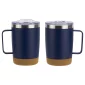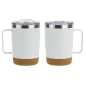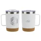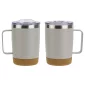 The Sapora 12 oz Stainless Steel Mug with Cork Base is constructed of 18/8 stainless steel with a powder-coated matte finish. The double-wall, vacuum-insulated mug has a decorative cork base, that is 90% cork & 10% cork glue, and molded matching metal handle. Clear plastic push-on lid with sip-thru opening and copper-lined to keep beverage hot for up to 6 hours and cold up to for 8 hours. Recommend hand wash only. BPA Free & FDA certified. Complies with FDA, Prop 65. 5.25" H x 3.5" Diameter