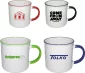 The Comfy 12 oz Mug. Measuring 3.37 (H) x 3.5 (D) inches in size, and made of Stoneware material. It features a 'C' shaped handle with a white glossy exterior finish with colored matching rim and handle. This high-quality mug is FDA certified, and it is microwave safe. It makes a perfect business gift idea. Hand wash recommended. Complies with FDA, LFGB. 3.37" H x 3.5" D