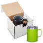 Kraft gift box packed with one matte finish powder-coated 12 Oz. (354 mL) double wall vacuum insulated coffee mug. Features 304 stainless steel interior, 201 stainless steel exterior and clear AS plastic lid. Vacuum insulation helps keep your beverages hot or cold longer than traditional insulation. Designed for use with both hot and cold liquids. Hand-wash only. Do not microwave. Do not place in freezer. Complies with Prop 65. 4.5" H x 4" W