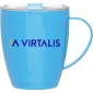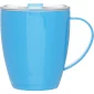 12 oz double wall 18/8 stainless steel thermal mug with copper vacuum insulation, clear acrylic push-on lid, and matching swivel. Complies with FDA, Prop 65. 4.4375" H x 4.875" W