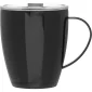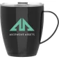 12 oz double wall 18/8 stainless steel thermal mug with copper vacuum insulation, clear acrylic push-on lid, and matching swivel. Complies with FDA, Prop 65. 4.4375" H x 4.875" W