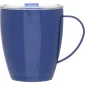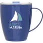 12 oz double wall 18/8 stainless steel thermal mug with copper vacuum insulation, clear acrylic push-on lid, and matching swivel. Complies with FDA, Prop 65. 4.4375" H x 4.875" W