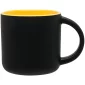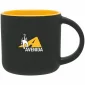 14 oz stoneware: matte black out / glossy color in. Hand wash recommended. Microwave safe with non-metallic imprint. Complies with FDA, Prop 65. 3.625" H x 5.125" W