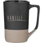 17 oz stoneware: matte color out / glossy color in with speckles and glazed clay base. Hand wash recommended. Microwave safe with non-metallic print. Complies with FDA, Prop 65. 5.375" H x 3.375" W