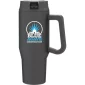 32 oz double wall 18/8 stainless steel thermal mug with copper vacuum insulation, threaded lid, matching flip-up spout, soft straw, wide handle, and powder coated finish. Individual gift box. Hand wash recommended. Do not microwave. Complies with FDA, Prop 65. 10.125" H x 3.75" W