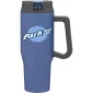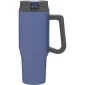 32 oz double wall 18/8 stainless steel thermal mug with copper vacuum insulation, threaded lid, matching flip-up spout, soft straw, wide handle, and powder coated finish. Individual gift box. Hand wash recommended. Do not microwave. Complies with FDA, Prop 65. 10.125" H x 3.75" W