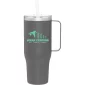 40 oz double wall 18/8 stainless steel thermal mug with copper vacuum insulation, stainless steel rim, dual-purpose push-on clear lid, matching sliding closure, flexible wide silicone straw, and powder coated finish. Individual gift box. Hand wash recommended. Do not microwave. Complies with FDA, Prop 65. 9.75" H x 4" W