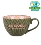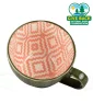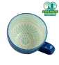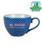 14 oz. stoneware mug with geo texture pattern on exterior and contrast printed design on interior. Hand wash only. 5 3/4" W x 3" H