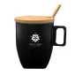 Matt finish ceramic mug with D shape handle Bamboo lid and a mini bamboo spoon included Bamboo lid could also serve as a coaster 300ml / 10 oz Packed in a nice gift box Price includes one location imprint on the mug OR one engraving logo on the bamboo lid