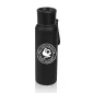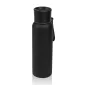 Textured black stainless steel sports water bottle- Features a wide mouth opening to fit ice cubes- Color contrasting flip lid prevents spills- Includes color matching silicone carry handle. 2.87" W x 9.62" H