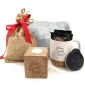 Gift pack contains: A super soft blanket with PVC gift bag – BK210 with one color imprint A wood block tea light holder – Candle03 with one engraved logo A cork bottom coffee mug – DW650 with one color logo A pack of 120g chocolate chip cookies in burlap bag – no logo A complimentary tea bag All items are packed in the blanket bag 3 setup charges required for this gift set