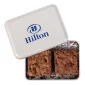 Tin filled with our Fresh Beginnings Fudge Brownies. 2 individually wrapped brownies. Your full color imprint featured on top of lid. Brownies are non-melt. Each brownie is approximately 2"x2". Best kept in the fridge or freezer. In the summer a reusable ice pack and insulated box are used for shipping. Ice will melt, brownies will be warm, no loss of quality. Place in refrigerator or freezer to cool on arrival or enjoy them immediately. 5" L x 3 1/2" W x 1 5/8" H