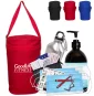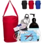 This gym travel care kit contains twenty-five pieces of FDA certified 3-ply non-woven ear-loop medical disposable masks with mask-wearing instruction, one 16.9 oz made in Canada hand sanitizer, one mini first-aid kit, two styluses, and a 16 oz aluminum bottle. Its made from polyester with nylon handle material, and measuring 9 (W) x 11.5 (H) inches in size. Sanitizer Specification: - 70% Alcohol gel Hand sanitizer - Bottle size: 16.9 oz. / 500 ml. - Health Canada Approved (NPN): 80101289. Complies with CE, FDA. 9" W x 11.5" H