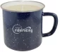 Happy Camper Candle, enamel mug w/SS rim This big classic ENAMEL coated mug with contrasting white interior features stainless steel rolled edge. Exclusive shape, comfort handle, glossy solid colour glaze with hand-speckles gives the piece a classic retro look. Each piece is unique. Classic outdoor 'Citronella' scent. Clean burning Coconut Wax candle with a braided cotton wick. 3.5" H x 3.66" Diameter