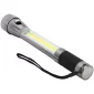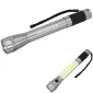 This light is constructed of aluminum with a push button action with CREE® XPE front lights (up to 120 Lumens). Push button again for white COB on barrel (240 Lumens). The third mode is red COBs flashing. Bottom magnet provides adhesion to car and other metal surfaces. Hand strap included. Includes 3 AAA batteries. 9.75" D x 1.5" W x 1.5" H