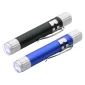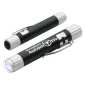 Bright LED light, Rubber on/off button, Powered by 4 LR44 button cell batteries, inserted. Complies with Prop 65. 3.625" H x 0.625" Diameter