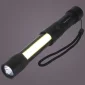 Output: up to 150 Lumens. Aluminum body. Magnetic base. Bulb Type: 3W LED and 3W COB. Function button switches between 4 modes: front (LED), barrel (COB), both front & barrel, and barrel (red COB flashing). Includes 3 x AAA batteries and hand strap. 1.25" D x 1.25" W x 9" H