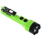 This flashlight features two body switches with an integrated tail cap and clip magnets for hands-free usage. Output: 300 lumens (flashlight), 200 lumens (floodlight), 350 (Dual-Light™), Certificate of Conformity. It includes 3x AA batteries, removable lanyard and bag, IP-X7 Waterproof, Bulb Type: CREE® LED, PC/ABS housing, 1-Year Limited Warranty. 2" D x 1.75" W x 7" H