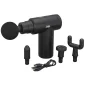 Deep muscle relief. Portable and lightweight. Noiseless operation. 6 speed high frequency vibration. 4 interchangeable heads: small flat head, ball head, tip head, and u-head. Battery life: 300 minutes. Charging time: 180 minutes. Extended battery life. ABS Plastic. 7.4V working voltage. 30W motor power. Non-waterproof. Use in temps: 23F to 104F / -5C to 40C. Includes mini massager, 4 massage heads, 1 Type-C charging cable, and user manual. 5.25" H x 2" W x 5.25" D