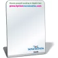 Highest Reflective Quality Free Standing .080 Acrylic Mirrors. Inkjet printed in high resolution 4 colour process, any bleed edge allowed. Stock Rectangular shape (3"x3.9") with rounded corners. Size shows imprint area, printed prior to heat bending. Separately priced option - Back Imprint. Removable protective film included. 3" W x 3.9" H x .08" Thick